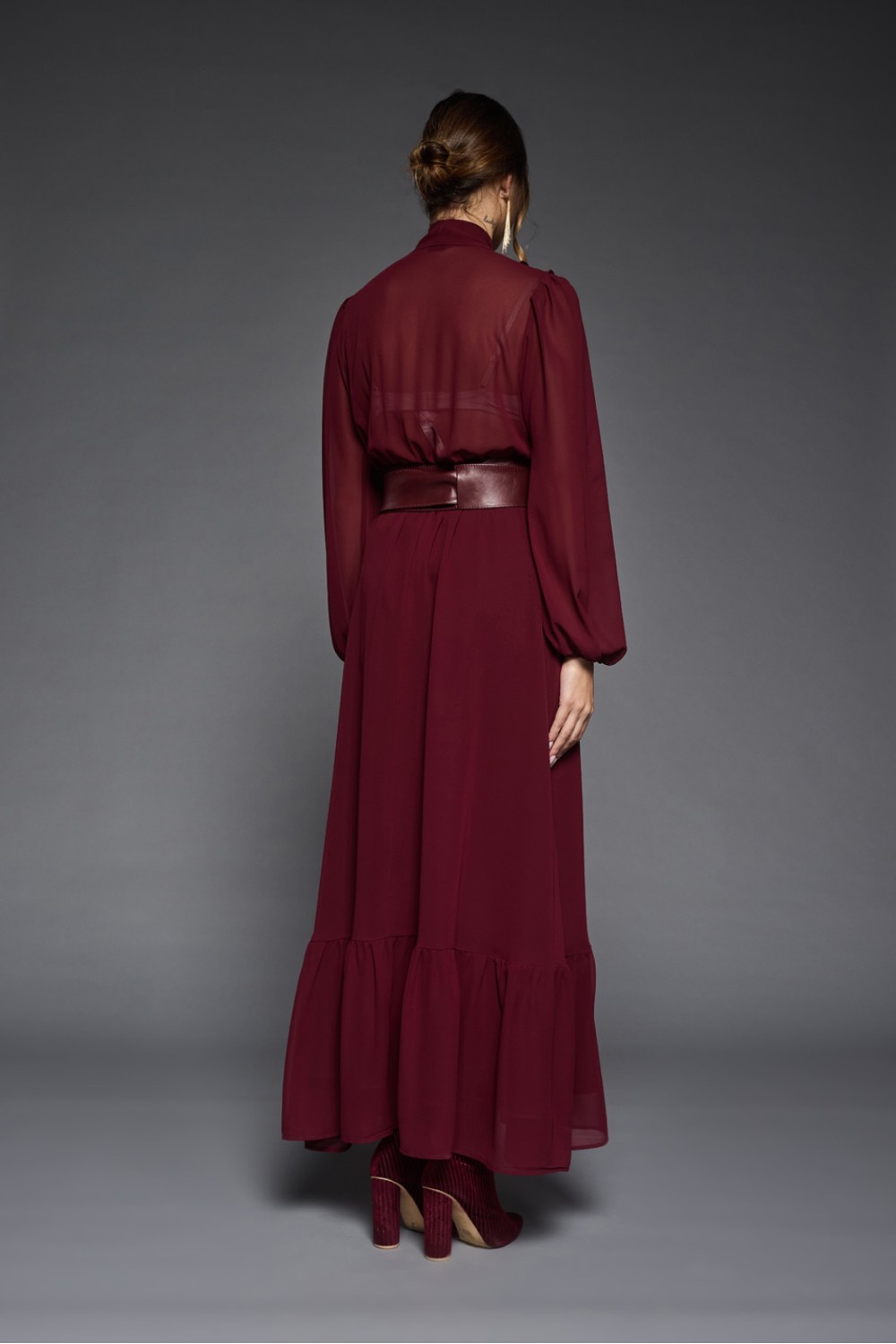 Vestito lungo con rouches e balza al fondo dallo stile romantico e femminile, perfetto per ogni occasione elegante.